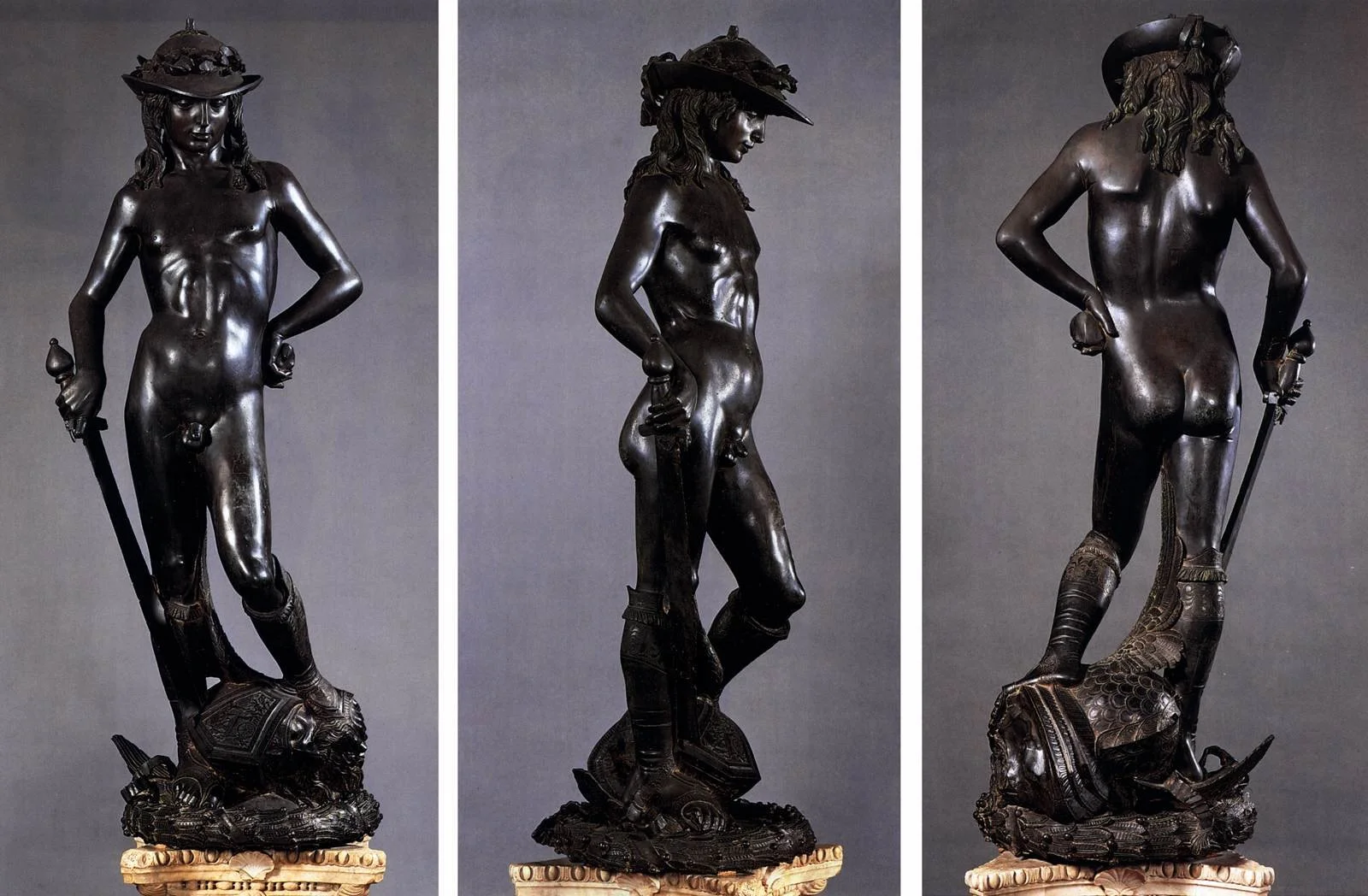 During the 1440s, the Italian city of Florence was flourishing in finances, political power and, of course, the arts. The city’s foremost sculptor, Donatello, unveiled a sleek bronze statue of a naked boy standing with sword and sling shot in hand. At his feet lies the decapitated head of a giant. David’s slaying of Goliath is a tale that, even today, still embodies strength and defiance; for fifteenth-century Florence, he reflected the Republic’s underdog mentality at a time when it was constantly threatened by greater powers. This was Donatello’s second sculpture of the Biblical shepherd-turned-king, the earlier work being a relatively conservative, armoured iteration of the hero in marble. His bronze David was a far cry from its predecessor, and not only in its materials and clothing… It also harked back to the practices and styles of the ancient world (it was thought to be the first free-standing nude sculpture since antiquity).