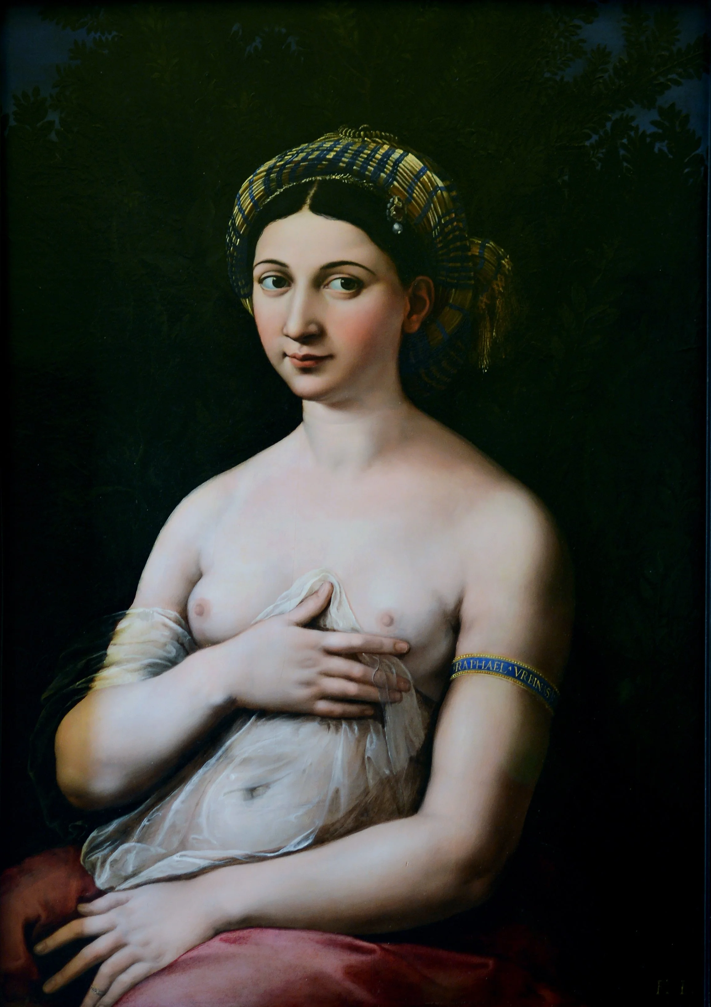 Raphael, La Fornarina, c.1519-20, oil on wood, 85 x 60 cm, Galleria Nazionale d'Arte Antica, Rome (Image: Wikipedia)