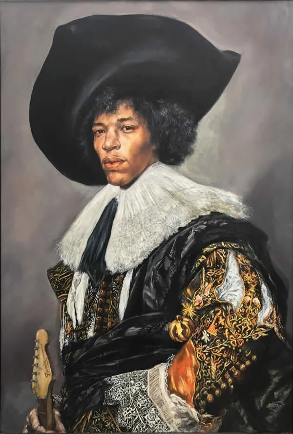 Frans Hals’ male portraits have also inspired contemporary artist Tam Joseph, whose Laughing Legend with Stratocaster (2013) is included in the exhibition catalogue. The painting casts legendary guitarist Jimi Hendrix’s head on the body of Frans Hals’s famous ‘Laughing Cavalier’ (painted in 1624 and star of the Wallace Collection). Joseph’s painting juxtaposes traditional celebrity and status, as seen by the seventeenth-century Dutch elite, with modern associations – embodied by Hendrix – of musical talent and fame in the twentieth century. The painting brings together Joseph’s admiration for both Hals as a painter, and Hendrix as a musician, as well as his sense of the mirrored flamboyance between Hendrix and the Laughing Cavalier.