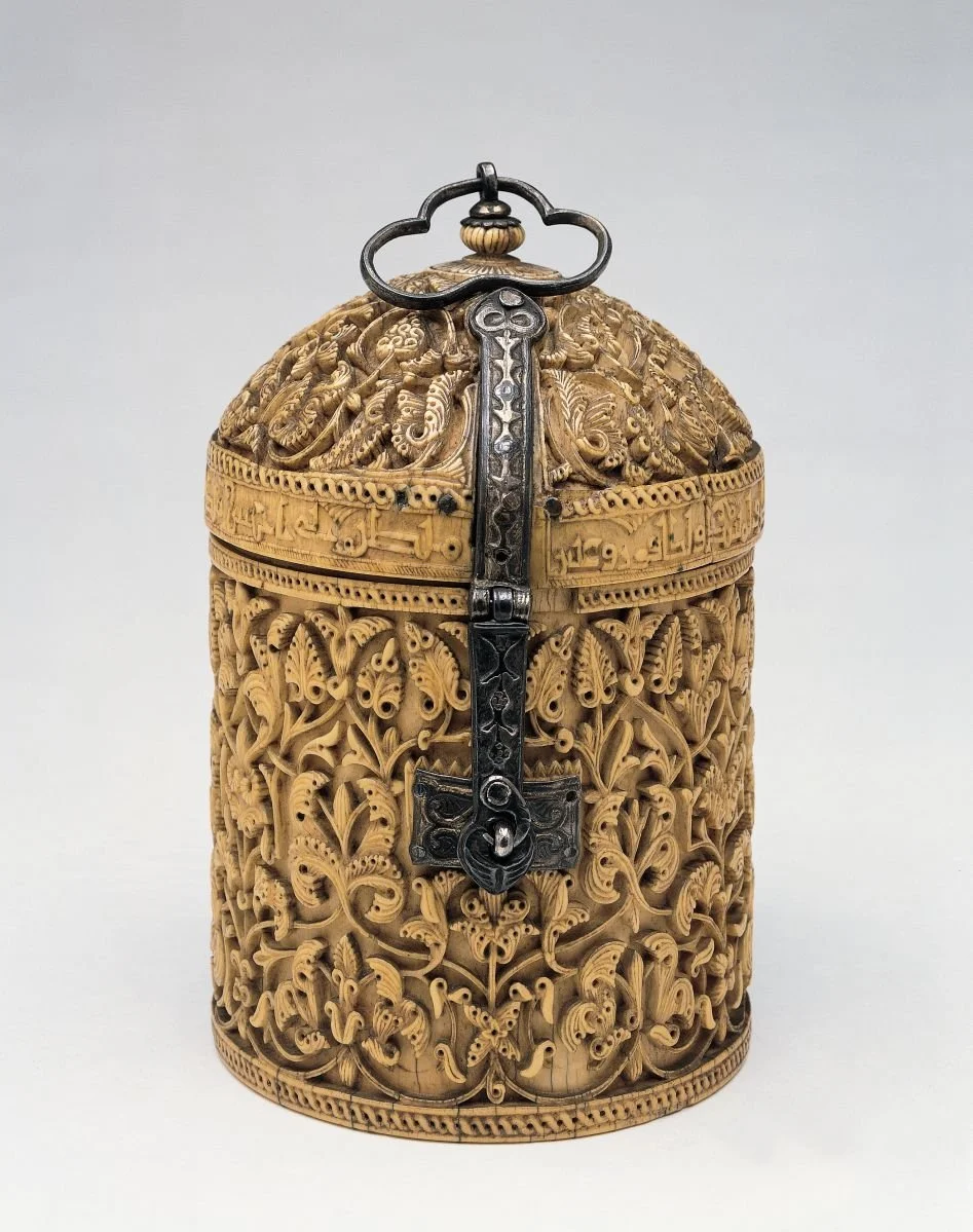 Khalaf, Pyxis, c. 966, ivory with chased and nielloed silver-gilt mounts, New York, The Hispanic Society of America (Image: Museum of Fine Arts Houston)