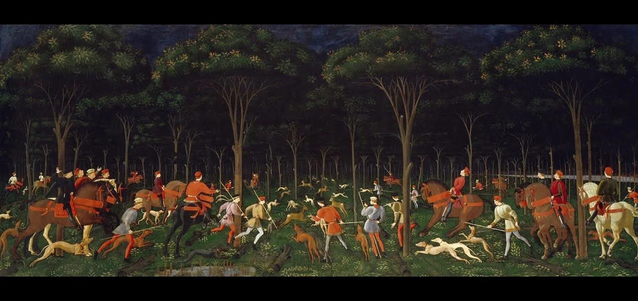 Paolo di Dono, called Uccello, The Hunt In The Forest, c. 1465–1470, tempera and oil with traces of gold on panel, 73.3 x 177 cm, Ashmolean Museum, Oxford (Image: Ashmolean)